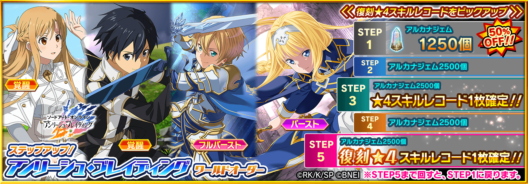 「ソードアート・オンライン アンリーシュ・ブレイディング」から、「キリト」「アスナ」「アリス」「ユージオ」が復刻★4スキルレコードとして登場!