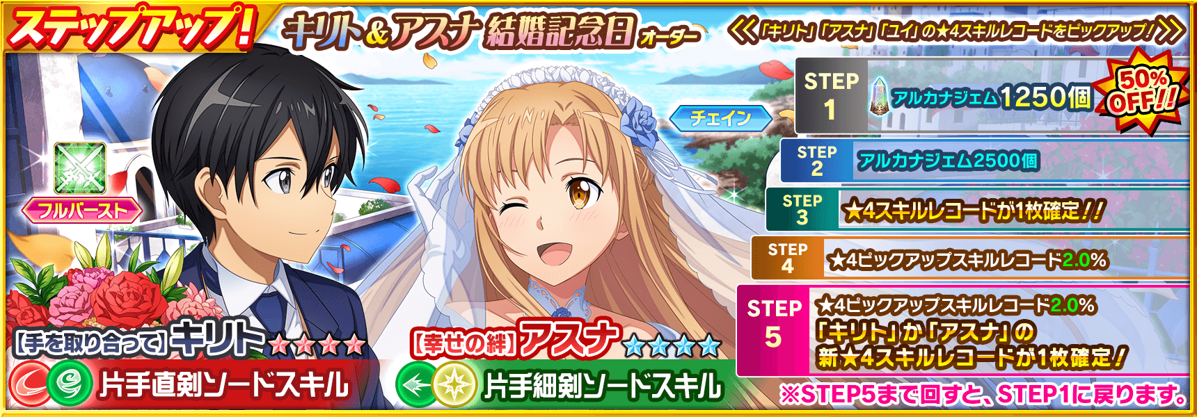 キリト&アスナの結婚記念日をお祝いして新★4スキルレコード「【手を取り合って】キリト(フルバーストスキル)」、「【幸せの絆】アスナ(チェインスキル)」が登場!